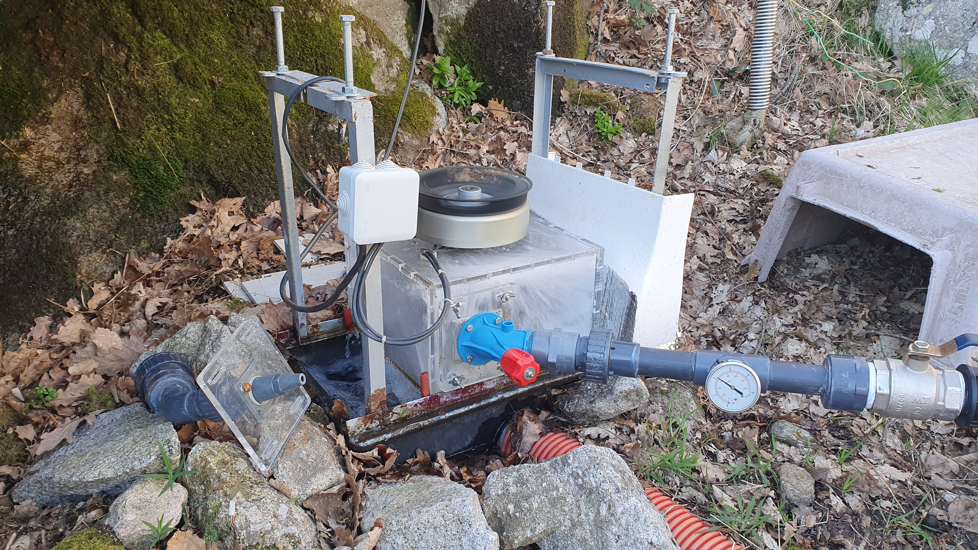 Lorsque le débit d'eau est important, j'utilise l'injecteur variable d'AG Hydro. Quand le débit diminue, je passe à des injecteurs fixes. La hauteur de chute est de 60 mètres, avec une conduite en PEHD de 44 mm de diamètre intérieur.
