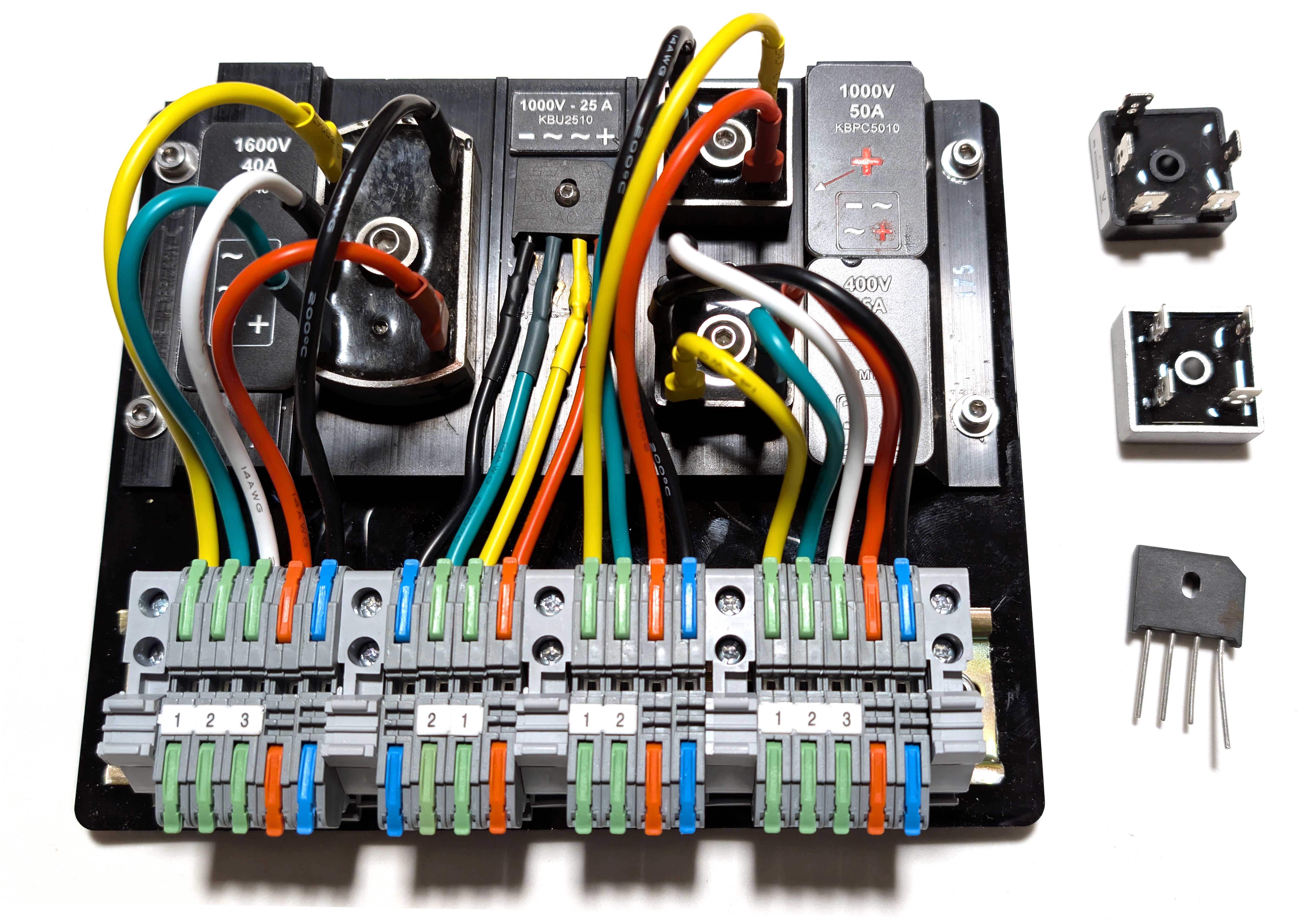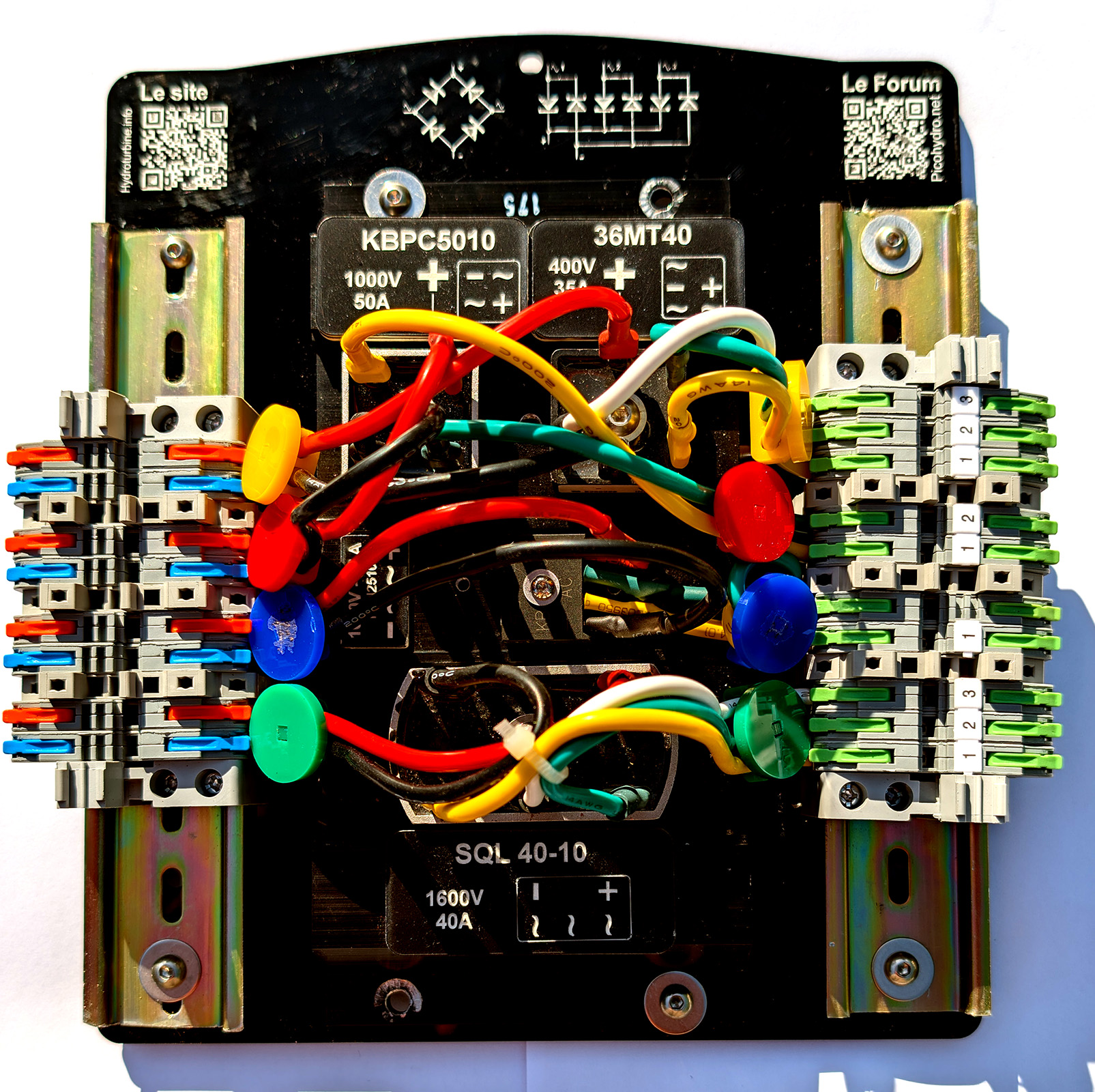 J'ai donc placé 4 ponts de diodes sur le radiateur d'un ancien régulateur Stecca, 2 ponts monophasés et 2 triphasés avec des valeurs de tension et d'intensité différentes.