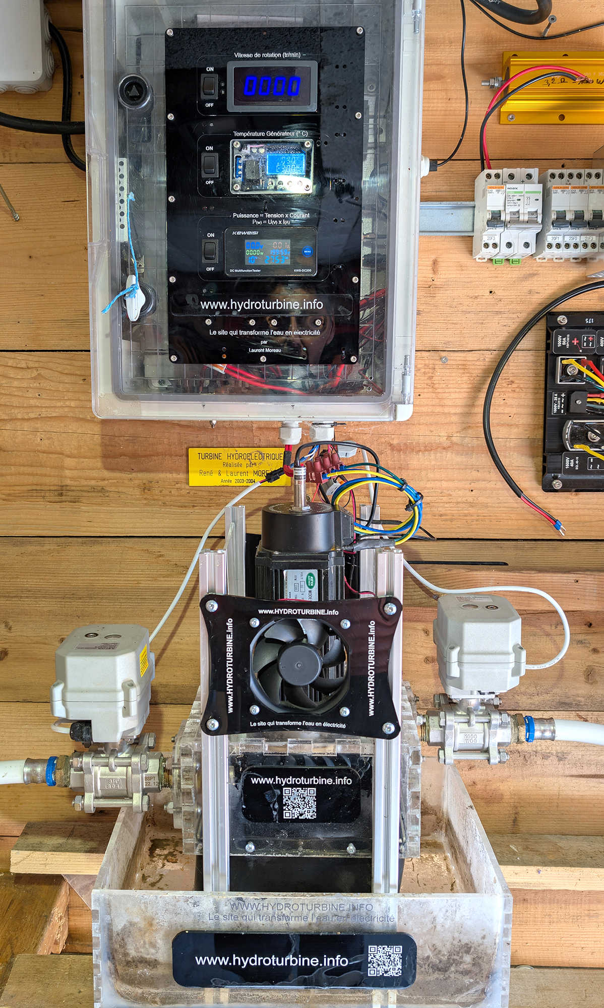 La turbine est construite autour d’une roue Pelton de 100 mm de diamètre. Elle entraîne un servo-moteur type KY80AS0404-15 (48V-400W-1500rpm) monté verticalement.