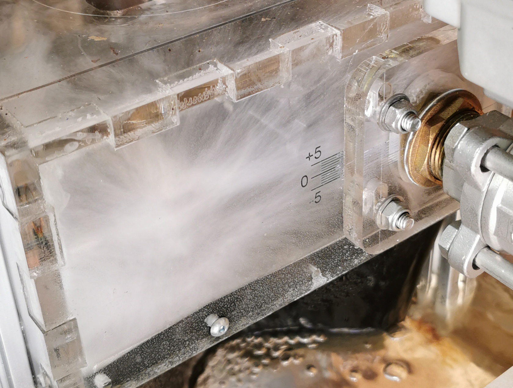 Deux "lumières" permettent d’ajuster finement les supports injecteurs en hauteur afin que les jets s’alignent parfaitement avec le fil de la roue. L'ensemble est suspendu par l’intermédiaire de 4 profilés en aluminium carrés de 20 x 20 mm permettant un réglage adapté à la hauteur du bac d’évacuation.